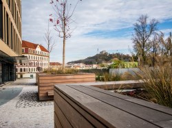 Parkování v budově je zajištěno podzemním parkovištěm, přičemž poměr parkovacích stání ku pronajaté ploše vychází 1 místo na 180m² cena 130 EUR + 250 Kč služby.
