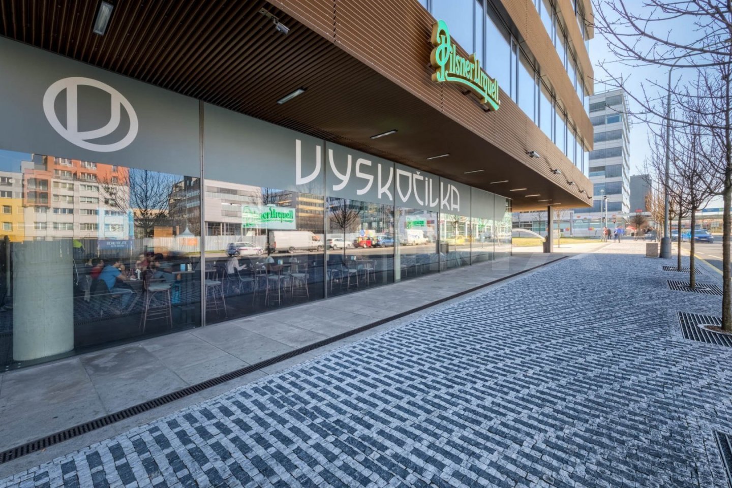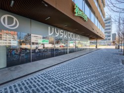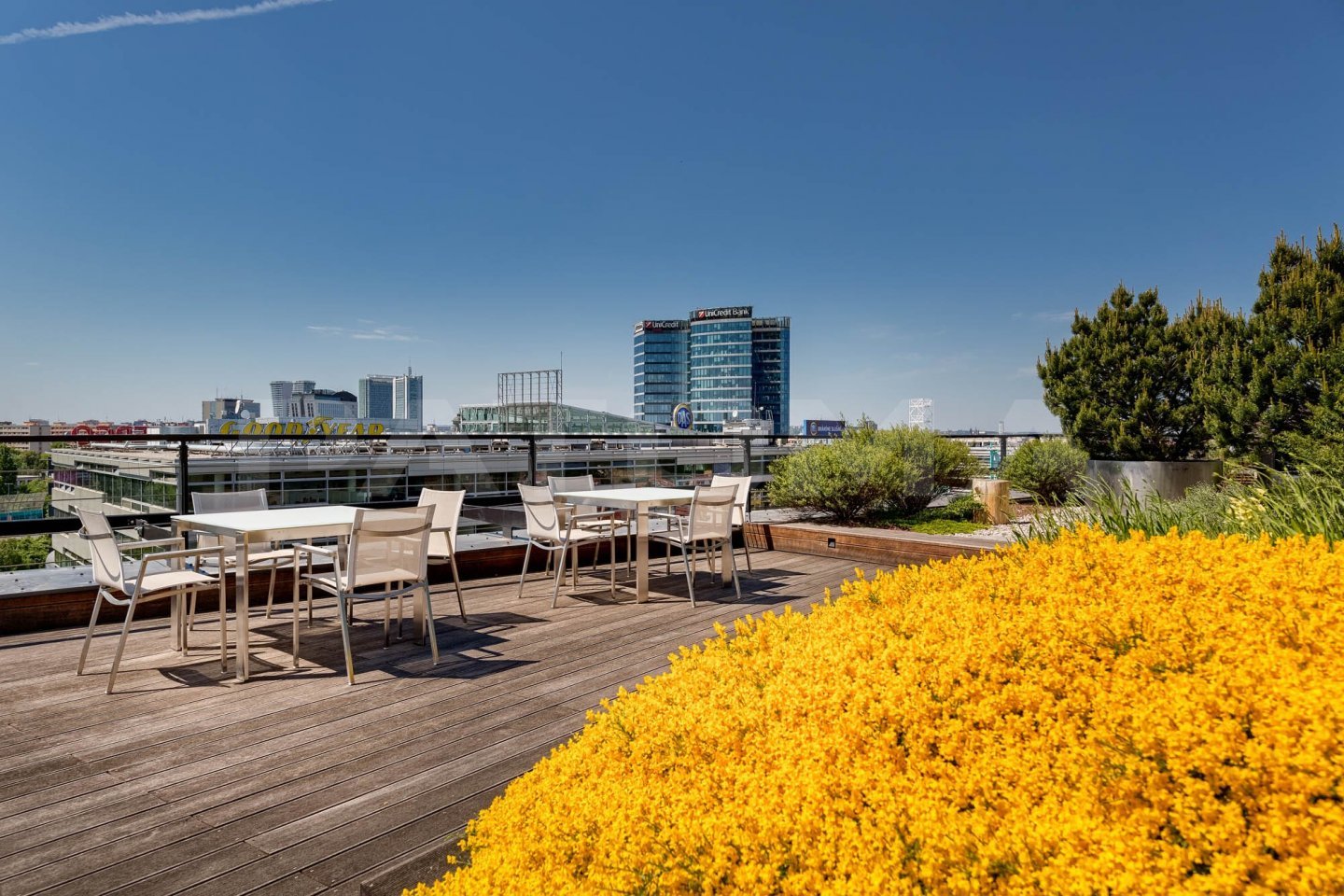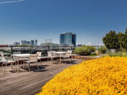 K dispozici jsou nájemcům střešní terasy s bohatou zelení a relaxačními zónami, kantýna a restaurace.