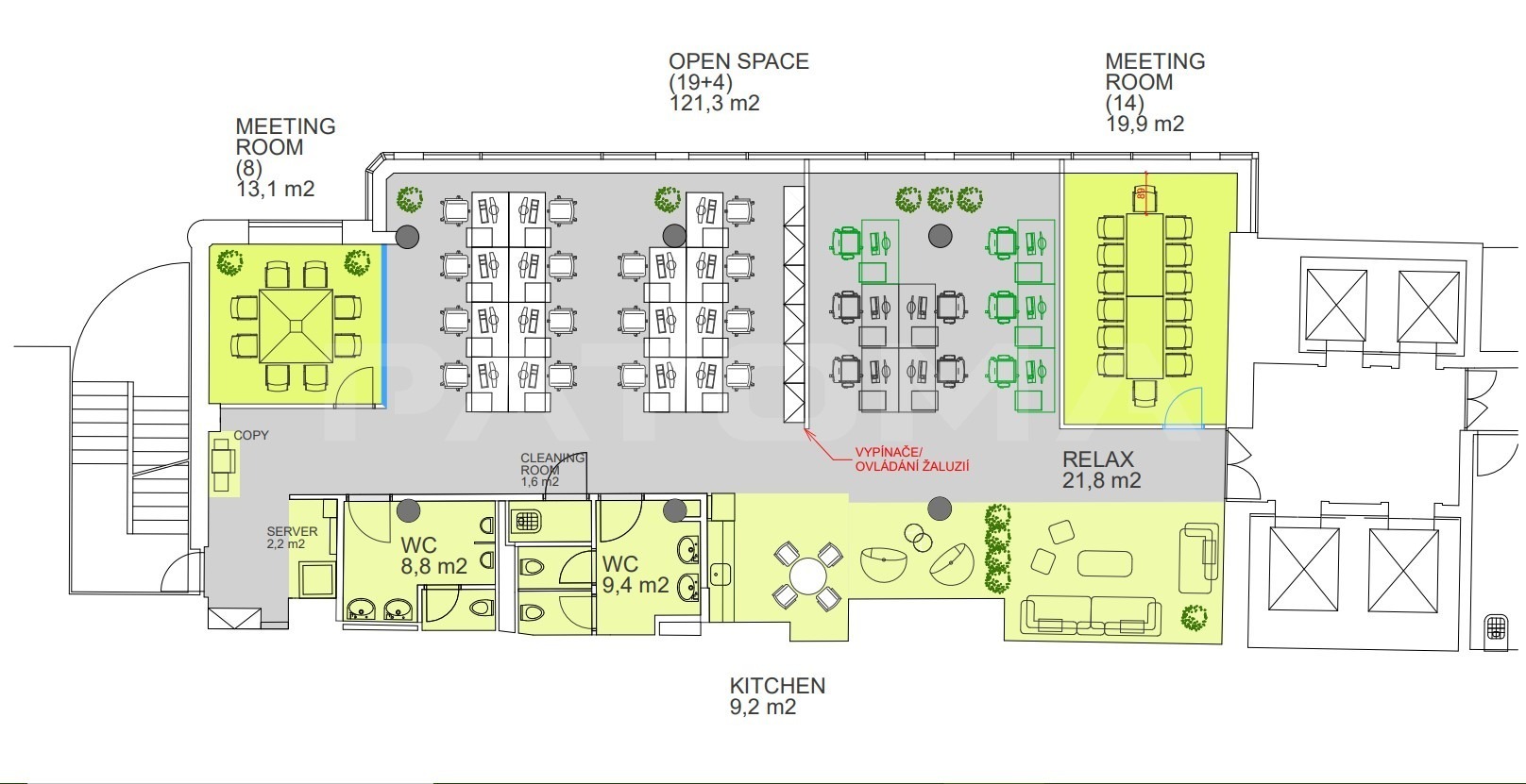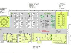 Samotné kanceláře jsou momentálně řešeny jako prostor openspace Součástí kanceláří je vlastní kuchyňka a toalety. V jednotlivých místnostech jsou zdvojené podlahy včetně podlahových krabic pro strukturovanou kabeláž. Jsou zde otevíratelná okna.