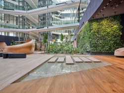 Velkorysé atrium s relaxačními zákoutími a vodními prvky, pobytová střešní terasa se zahradou a venkovní kuchyní, vlastní kantýna a jiné služby. Kolárna s šatnami a sociálním zázemím. Nabíjecí stanice pro elektromobily.
