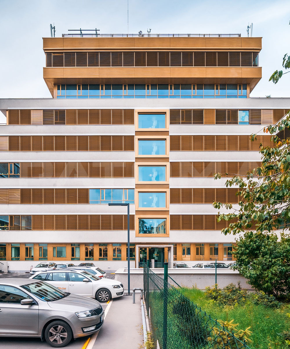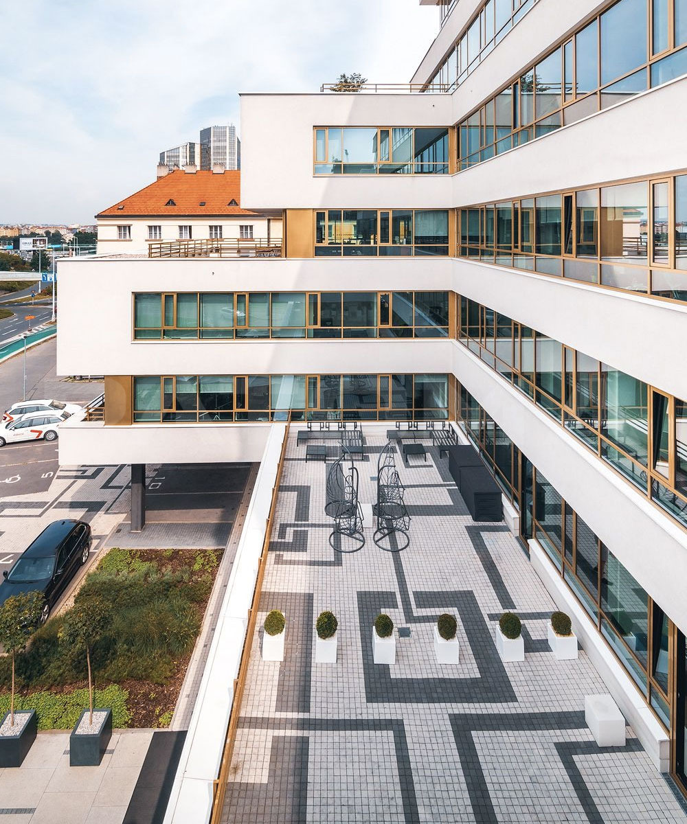 Budova nabízí místa pro parkování, speciální systém chlazení a topení v podobě chladících stropů, zdvojené podlahy či otevíratelná okna.