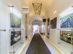 Vchod do jednotky je skrz skleněné dveře, které jsou součástí velké výlohy přes celou přední stěnu. Je zde vybudováno i malé zázemí. Samozřejmostí je vývěsní štít stylově sladěný s ostatními obchody v Pánské pasáži.