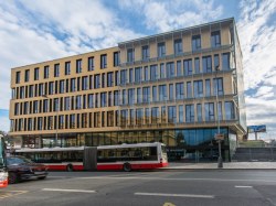 Parkování v budově je zajištěno podzemním parkovištěm, přičemž poměr parkovacích stání ku pronajaté ploše vychází 1 místo na 180m² cena 130 EUR + 250 Kč služby.
