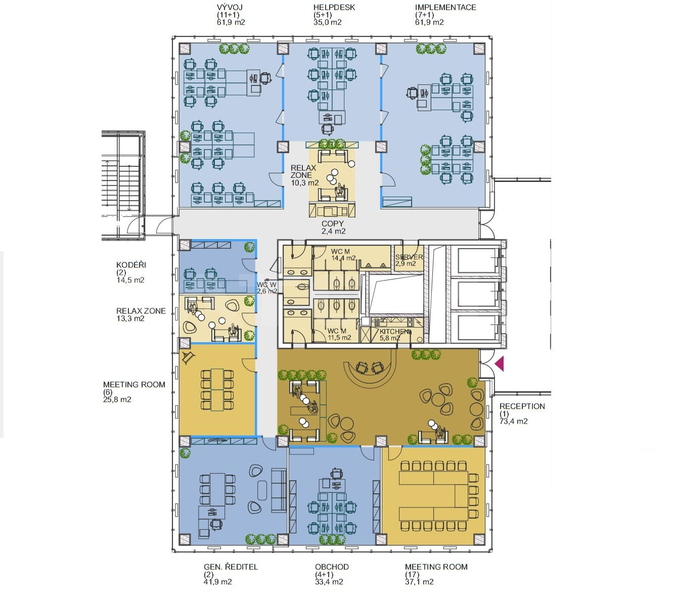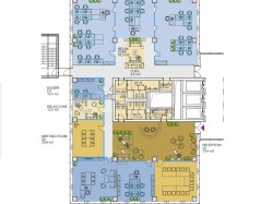 Kancelářská plocha se upraví dle potřeb zájemce. Kanceláře jsou klimatizované, bezbariérové, mají vlastní kuchyňku a toalety. Z prostor je neobyčejný výhled na Prahu.