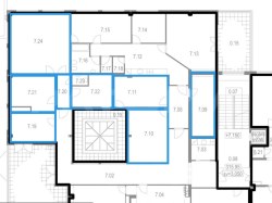 Dispozičně se jedná o 7 kanceláří, sklad, serverovnu a vlastní sociální zázemí. Kuchyňka je nyní sdílená na patře, po dohodě s pronajímatelem je možné vybudovat vlastní. Dispozice viz plánek (modře).