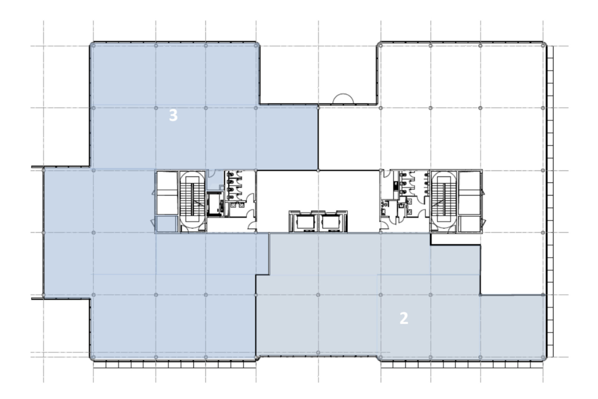 Kancelářská jednotka se skládá ze dvou celku (591 m² a 951 m²), které lze pronajmou i samostatně.