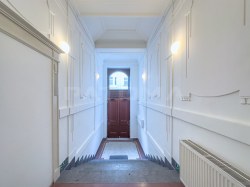 Vysoká členěná oblouková okna, která doplňují vnitřní prosklené dveře s dekorativními motivy secese.