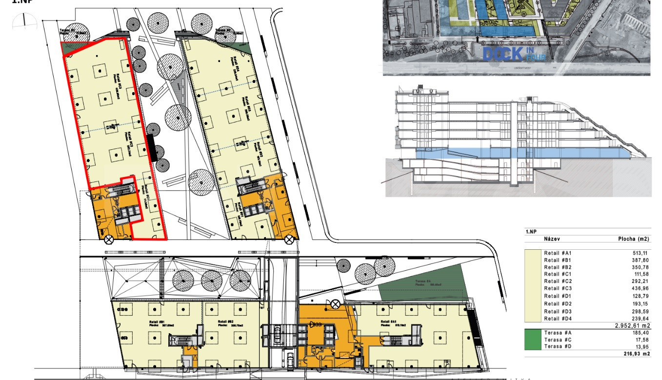 Dovolujeme si Vám nabídnout k pronájmu obchodní prostory nacházející se v přízemí objektu DOCK IN FOUR o celkové výměře 119 m² + terasa 15 m².